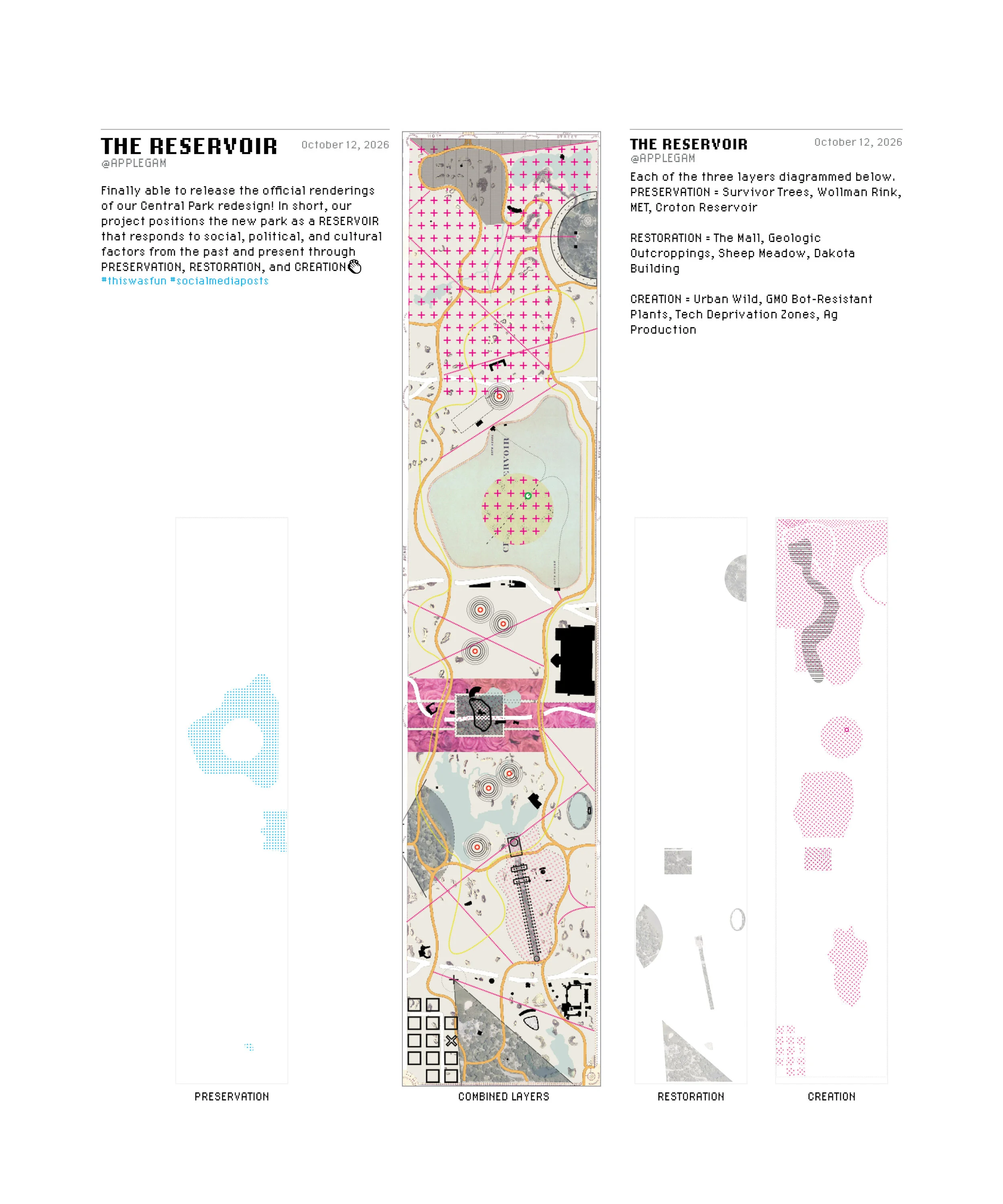 APPLELAMALGAM won the public competition to restore order to Central Park after the eco-terrorist group, the Gaians, destroyed the park’s natural systems in 2018. Unique to the submission by APPLELAMALGAM was the creation of a multiplicity of landscape experiences that varied greatly across Central Park. In addition, APPLELAMALGAM embraced the principle that landscape architecture should work to connect people socially as well as disconnect them digitally.